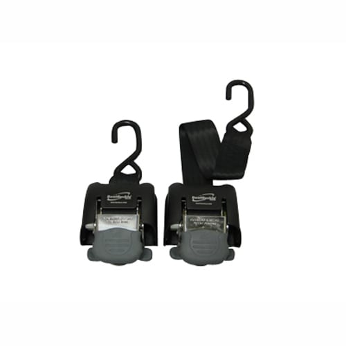 トランサムタイダウンシステムはトレーラーの後端付近に写真のようにセットして使用します。本体ハウジング内に内蔵されたラチェット機構でボートを固定し、未使用時にベルトはハウジング内に自動で巻きとられます。使用毎のベルトの脱着や片付けの手間がいらず便利です。